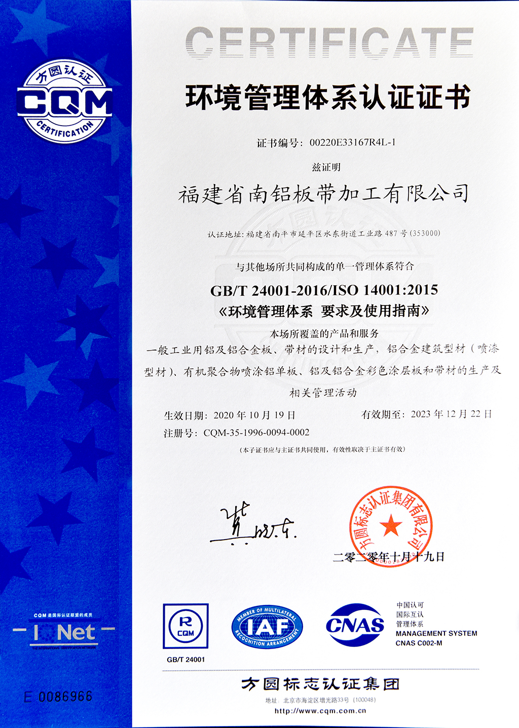 环境管理体系认证证书--南铝板带